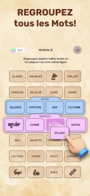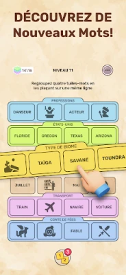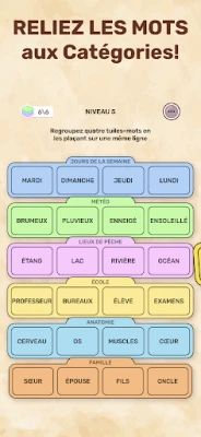 Chaque niveau de Connect Word – Jeux de Mots vous met au défi de repérer les liens sémantiques subtils entre un ensemble de termes. Votre tâche est de regrouper ces mots, parfois dispersés, autour d'un sens commun ou d'un thème caché, révélant ainsi l'énigme sous-jacente. L'ingéniosité est de mise : au-delà de la simple connaissance, c'est votre capacité à penser de manière latérale et à anticiper les associations qui vous mènera à la solution. La complexité s'accroît à mesure que vous progressez, garantissant une courbe d'apprentissage stimulante et une satisfaction constante.