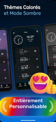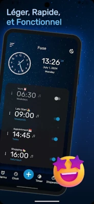 Fuse : Réveil & Minuteur va au-delà du réveil, en intégrant une suite d'outils pratiques et esthétiques. Explorez le monde grâce à son horloge mondiale fonctionnelle et son widget dédié, vous permettant de suivre l'heure dans toutes les métropoles. Utilisez le minuteur précis pour vos activités sportives, culinaires ou professionnelles, disponible également en widget pour un accès rapide. Le chronomètre avancé, capable de mesurer au centième de seconde, est parfait pour suivre vos performances et partager vos temps. Enfin, personnalisez votre espace avec des thèmes colorés, un mode sombre élégant et une horloge de chevet au charme rétro, faisant de Fuse : Réveil & Minuteur une solution complète, légère et performante, même en arrière-plan.